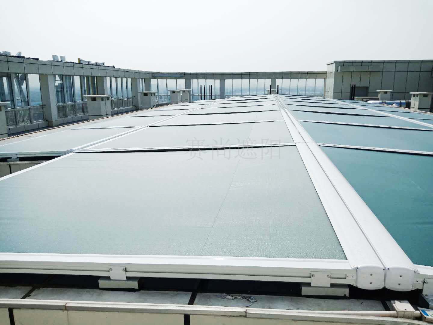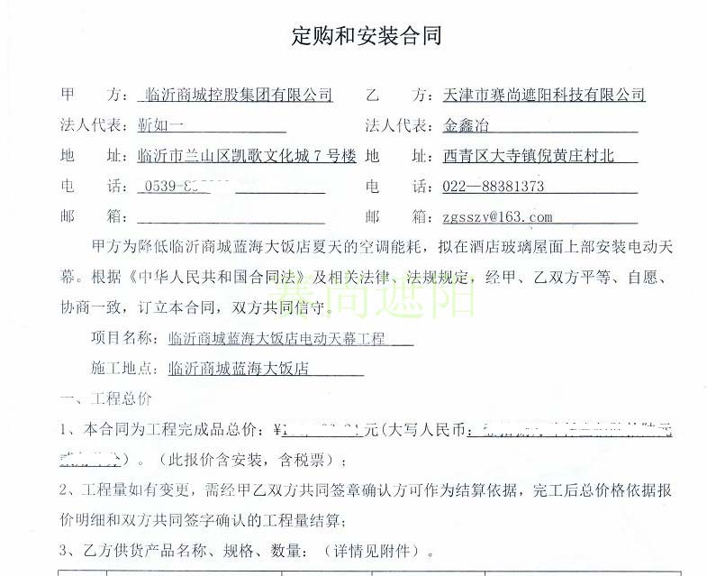 賽尚遮陽與臨沂商城控股集團有限公司在2018年7月初簽訂了臨沂商城藍海大飯店電動天幕簾系統工程合同。工程應用的遮陽產品為電動天幕簾,數量28套,采用了風光雨感應系統。