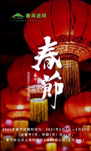 賽尚遮陽(yáng)2021年春節(jié)放假時(shí)間為:2021年2月1日—2月21日(含春節(jié)7天、年假7天)共21天。