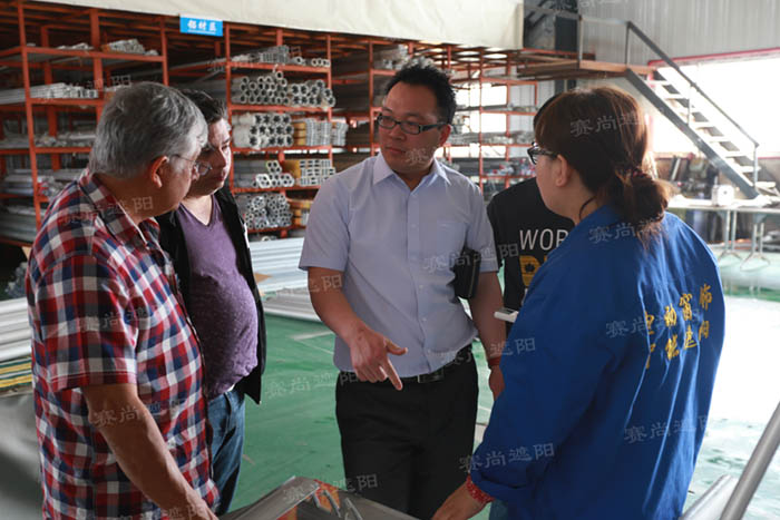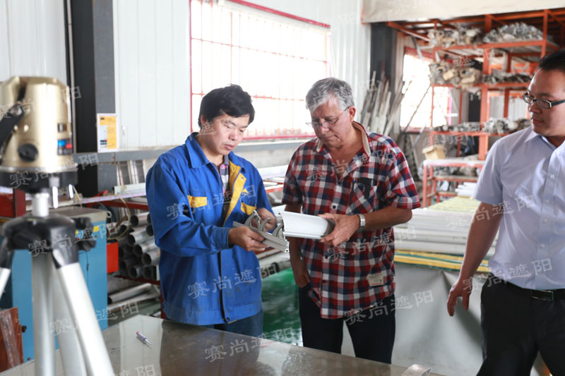 5月13日,巴拿馬建筑工程開發(fā)商來天津市賽尚遮陽科技有限公司實(shí)地考察,現(xiàn)場調(diào)研了解梭形百葉、歐式百葉組裝過程和風(fēng)格樣式以及實(shí)地考察了鋁型材的生產(chǎn)工藝。陪同來訪的有該建筑開發(fā)商項(xiàng)目負(fù)責(zé)人Cessa、在中國常駐的采購商以及他們的司機(jī),我公司負(fù)責(zé)接待的同志有外貿(mào)主管劉環(huán)宇、技術(shù)主管段師傅。