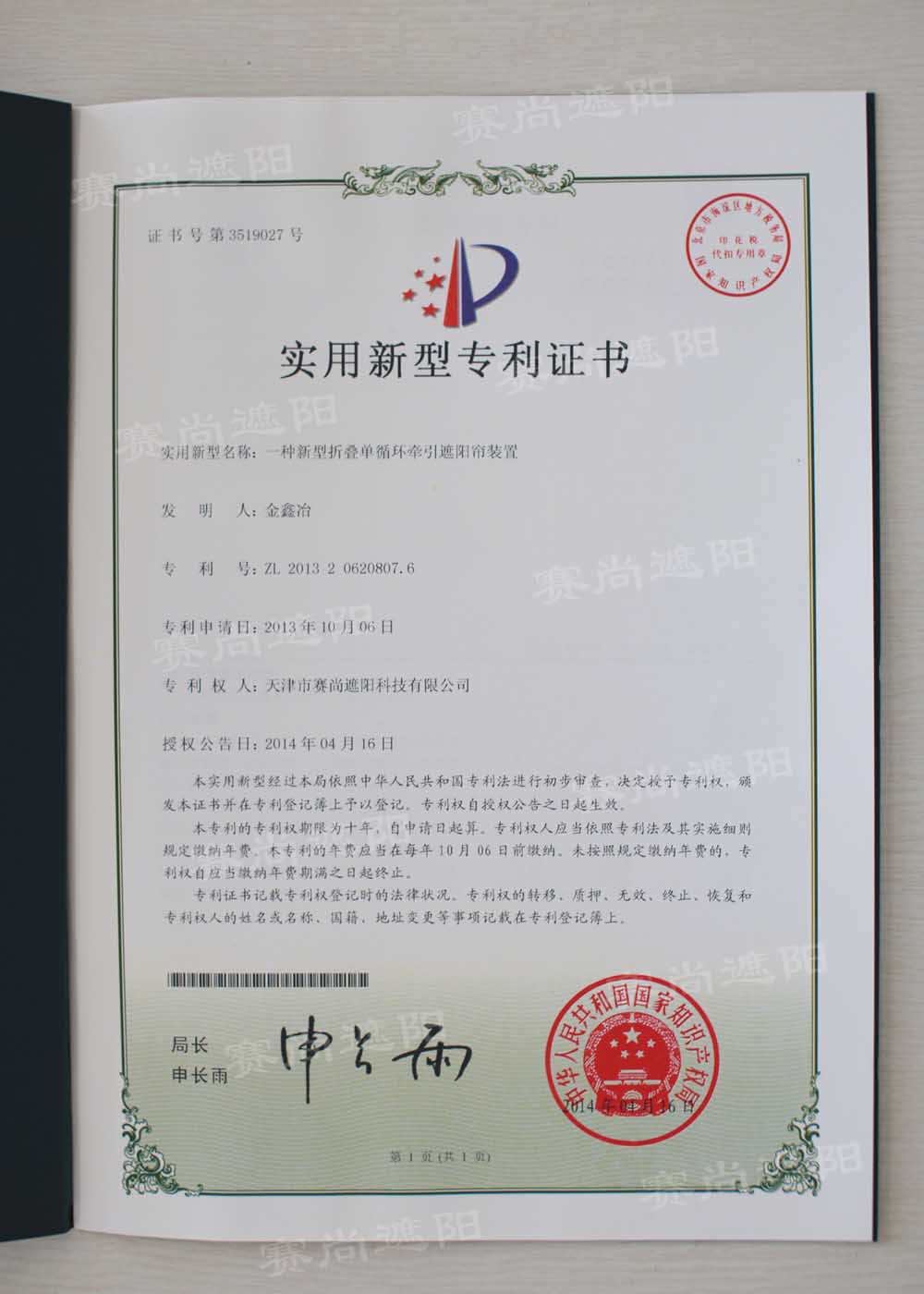 2014年4月16日,天津市賽尚遮陽科技有限公司一項由公司總經理金鑫冶先生發明的專利正式通過了中華人民共和國國家知識產權局的審批。該專利類型為實用新型專利證書,其具體名稱是:一種新型折疊單循環牽引遮陽簾裝置,證書號:3519027,專利號:ZL 2013 2 0620807.6。此次專利申請長達半年,專利順利獲批也標志著我公司的科技研發水平往上又邁了一個新的臺階,這也將大大提升我公司的市場核心競爭力。下面是此項證書的內容介紹:
