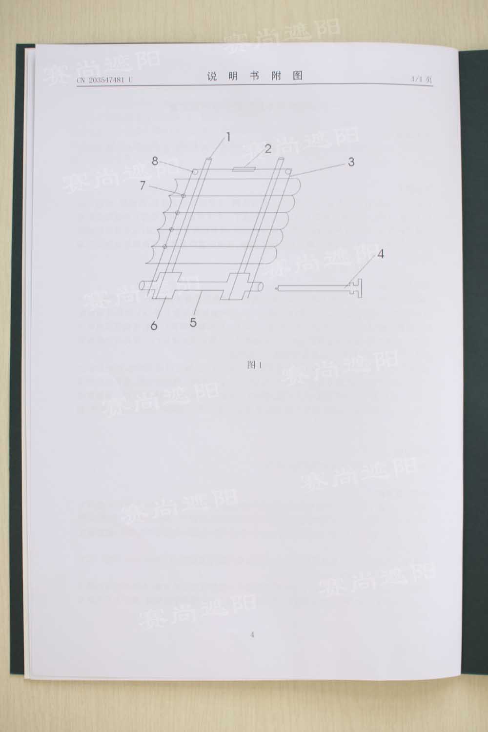 此項發明專利技術目前尚未應用于公司產品,新專利的取得不會對公司目前經營產生重大影響,但有利于發揮公司的自主知識產權優勢和完善知識產權保護體系,有利于增強公司的核心競爭力。天津市賽尚遮陽科技有限公司作為天津市創新型企業,在科技研發的道路上始終孜孜不倦地摸索著。多年來,企業以獨特的眼光、超前的意識,積極實施品牌戰略,努力樹立企業形象。展望未來,賽尚將一如既往地為您提供全方位的遮陽解決方案,您的舒適生活賽尚愿和您共同構建。