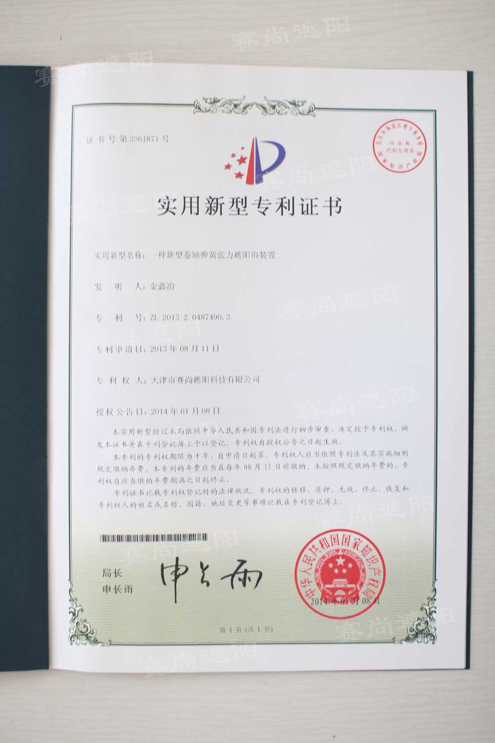 2014年1月8日,天津市賽尚遮陽科技有限公司一項由公司總經理金鑫冶先生發明的專利正式通過了中華人民共和國國家知識產權局的審批。該專利類型為實用新型專利證書,其具體名稱是:一種新型卷軸彈簧張力遮陽簾裝置,證書號:3361871,專利號:ZL 2013 2 0487490.3。此次專利申請近半年,專利順利獲批也標志著我公司的科技研發水平往上又邁了一個新的臺階,這也將大大提升我公司的市場核心競爭力。下面是此項證書的內容介紹: