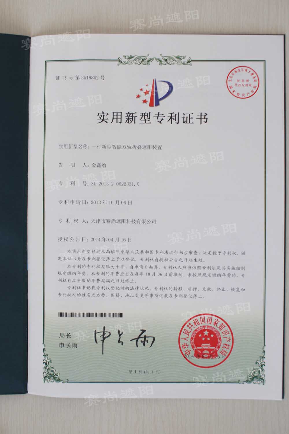 2014年4月16日,天津市賽尚遮陽科技有限公司一項由公司總經理金鑫冶先生發明的專利正式通過了中華人民共和國國家知識產權局的審批。該專利類型為實用新型專利證書,其具體名稱是:一種新型智能雙軌折疊遮陽裝置,證書號:3518852,專利號:ZL 2013 2 0622331.X。此次專利申請近半年,專利順利獲批也標志著我公司的科技研發水平往上又邁了一個新的臺階,這也將大大提升我公司的市場核心競爭力。下面是此項證書的內容介紹: