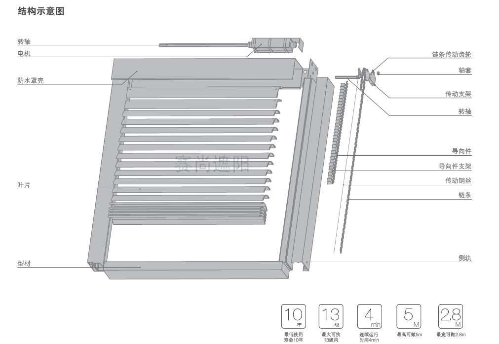 葉片單面厚度達到1.2mm,雙邊厚度達到8mm,葉片和傳動件之間采用金屬件連接,邊框采用型材固定,閉合起來阻擋達到97%,對用戶的私密性,起到了很好的防護作用。