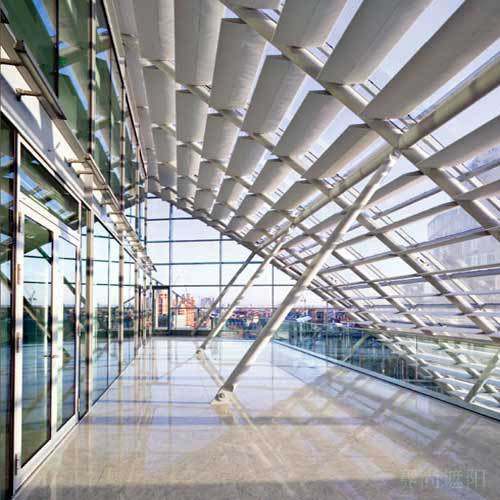 戶外機翼百葉遮陽系統(tǒng)平行于采光頂玻璃面安裝,葉片在推桿電機的作用下0-105度范圍內(nèi)任意角度翻轉(zhuǎn),亦可在自動光線跟蹤系統(tǒng)的作用下自動調(diào)節(jié)葉片角度進行遮陽或采光,使之在每天的任何時候都能幫助您獲得舒適的生活和工作環(huán)境。遮陽百葉可以遮擋太陽輻射高達80%,可節(jié)約30%以上的空調(diào)和其它采光設備造成的能耗費用。