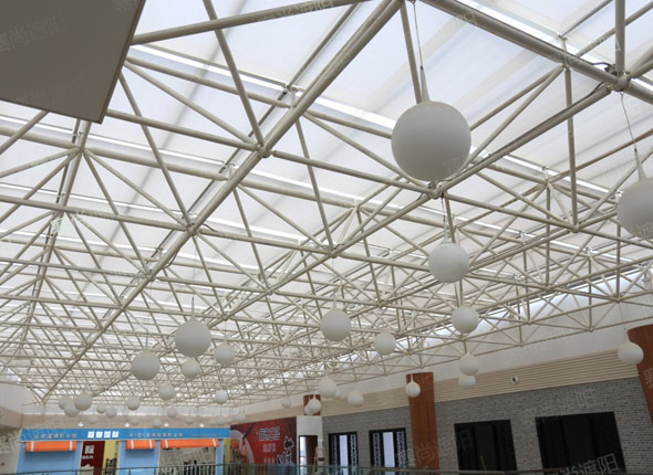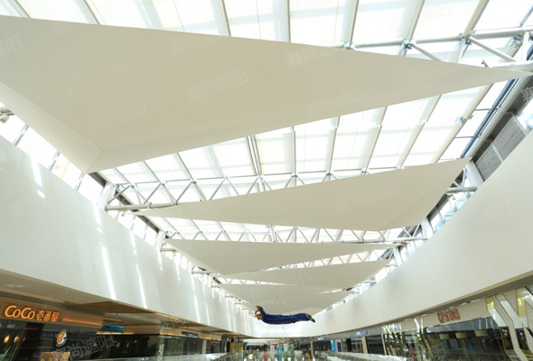 在采光頂遮陽方案設(shè)計中,一般都認為天棚簾之間空隙設(shè)計的越小越好,遮陽效果、隔熱效果相對都更好,有些不規(guī)則的邊角就做成了固定的天棚簾(圖一、二),結(jié)果整體的裝飾美觀效果可能并不盡如人意。而如果在采光頂遮陽方案設(shè)計中天棚簾之間的空隙加大些,邊角不規(guī)則的地方也空出來,既減少了材料,同時整體的裝飾美觀效果卻好很多(圖三、四),而且透進來的陽光形成等距光格,整體效果更加美觀,也沒有增加多少的炎熱感。尤其是對于大型高檔商場,更加注重室內(nèi)裝飾美觀效果,后者的遮陽方案效果顯然更美觀。值得我們?nèi)ゼ毤汅w會。