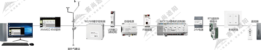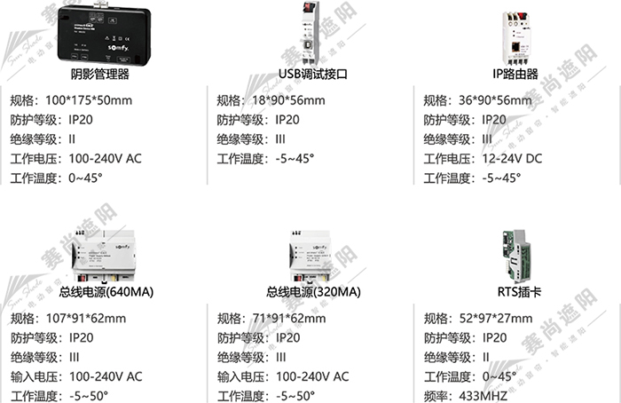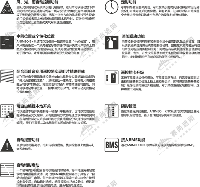 Somfy(法國尚飛)是全球領(lǐng)先的智能遮陽及門窗自動化系統(tǒng)解決方案的生產(chǎn)商之一,國際KNX協(xié)會成員之一。基于40多年的行業(yè)經(jīng)驗,尚飛公司的animeo KNX系統(tǒng)基于開發(fā)的KNX標(biāo)準研發(fā),并特別針對智能遮陽及電動開啟的需要而設(shè)計,是一套現(xiàn)代建筑智能遮陽集成系統(tǒng)的專業(yè)解決方案。SOMFY(法國尚飛)公司的Animeo KNX系統(tǒng),不僅具備了KNX/EIB系統(tǒng)的優(yōu)勢,還擁有許多其它的人性化設(shè)計,通過簡單適當(dāng)?shù)木幊毯驼{(diào)試,可以實現(xiàn)對于智能遮陽系統(tǒng)的控制要求。