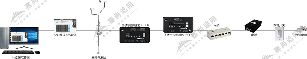 使用者可以通過接入數字化網絡(如互聯網、RS485網絡等)的電腦或觸屏設備對遮陽產品進行控制。遮陽系統也可以通過網絡與建筑中的其它系統如空調、照明等系統進行結合,通過對遮陽產品的精確控制,實現更佳的節能效果。