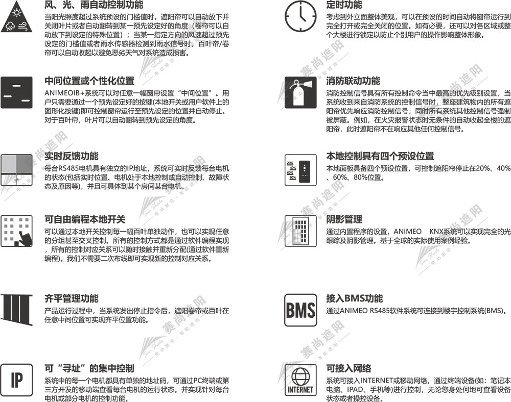 Animeo IP/RS485是Somfy新一代基于內置總線控制模塊的智能電機及智能開關控制的智能遮陽系統。RS485總線是一種標準的雙向通訊網絡。雙向通訊可以保證系統可以接收到網絡中每一臺電機的反饋信號,對每臺電機的位置及狀態進行監控。Animeo IP/RS485系統可以輕松地接入互聯網。通過互聯網,使用者可以與系統建立遠程連接。這些特點為當下新型的節能智慧建筑提供了不同以往的設置及支持服務。