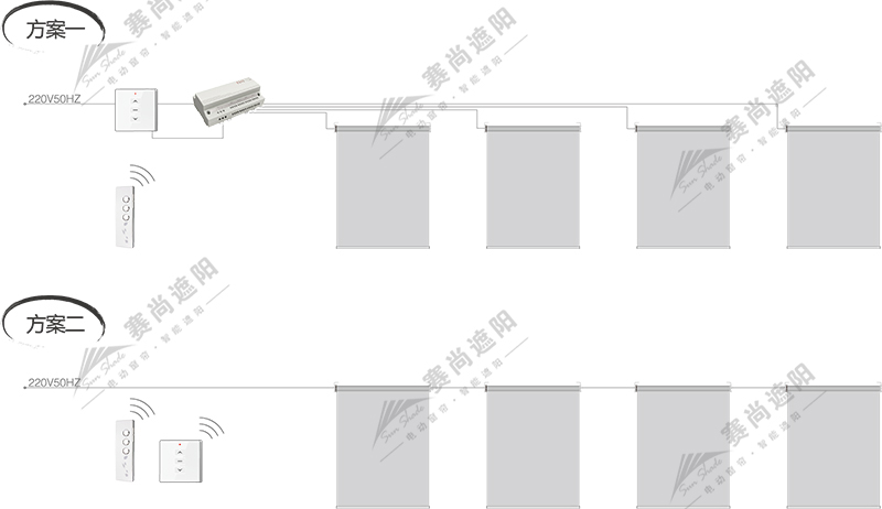 實際生活中,項目或某個建筑空間內對于遮陽產品的群控或者區(qū)域控制應用更廣泛。而群也有兩種不同實現方案,一是采用外置電機配合組控器、控制器、遙控器來實現,此方案適用于所有需要區(qū)域控制或群控的項目,架構簡單并且非常穩(wěn)定,缺點在于如果需要調整控制產品或區(qū)域,僅限于在已布線的框架基礎之上。二是采用內置電機配合遙控器、無線控制面板,此方案適合遮陽產品數量少,建筑空間較小的項目。反之,則可能會出現遙控器出現串頻或無法控制本區(qū)域內的遮陽產品、誤控制其他區(qū)域的遮陽產品等情況出現。