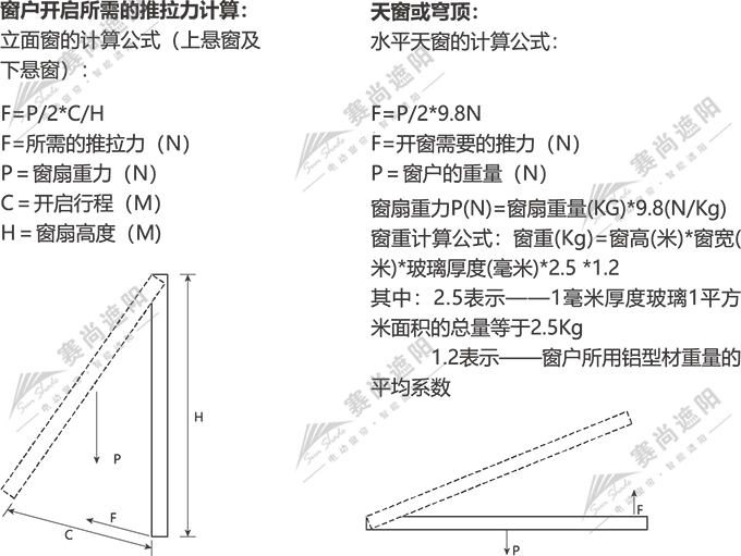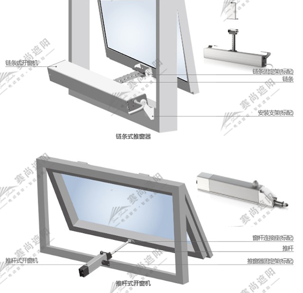 當窗戶需要與消防聯動時,需要考慮作用在窗體上荷載,請聯絡公司技術人員進行進一步的計算開窗所需的推力,以便選擇適當推力的開窗器。當窗戶的寬度大于1200mm時,開窗至少需要2個推點,2只開窗器需要配置電子同步器,以確保窗體不變形,不被損壞。窗戶的高度至少是選擇開窗器行程的2倍。